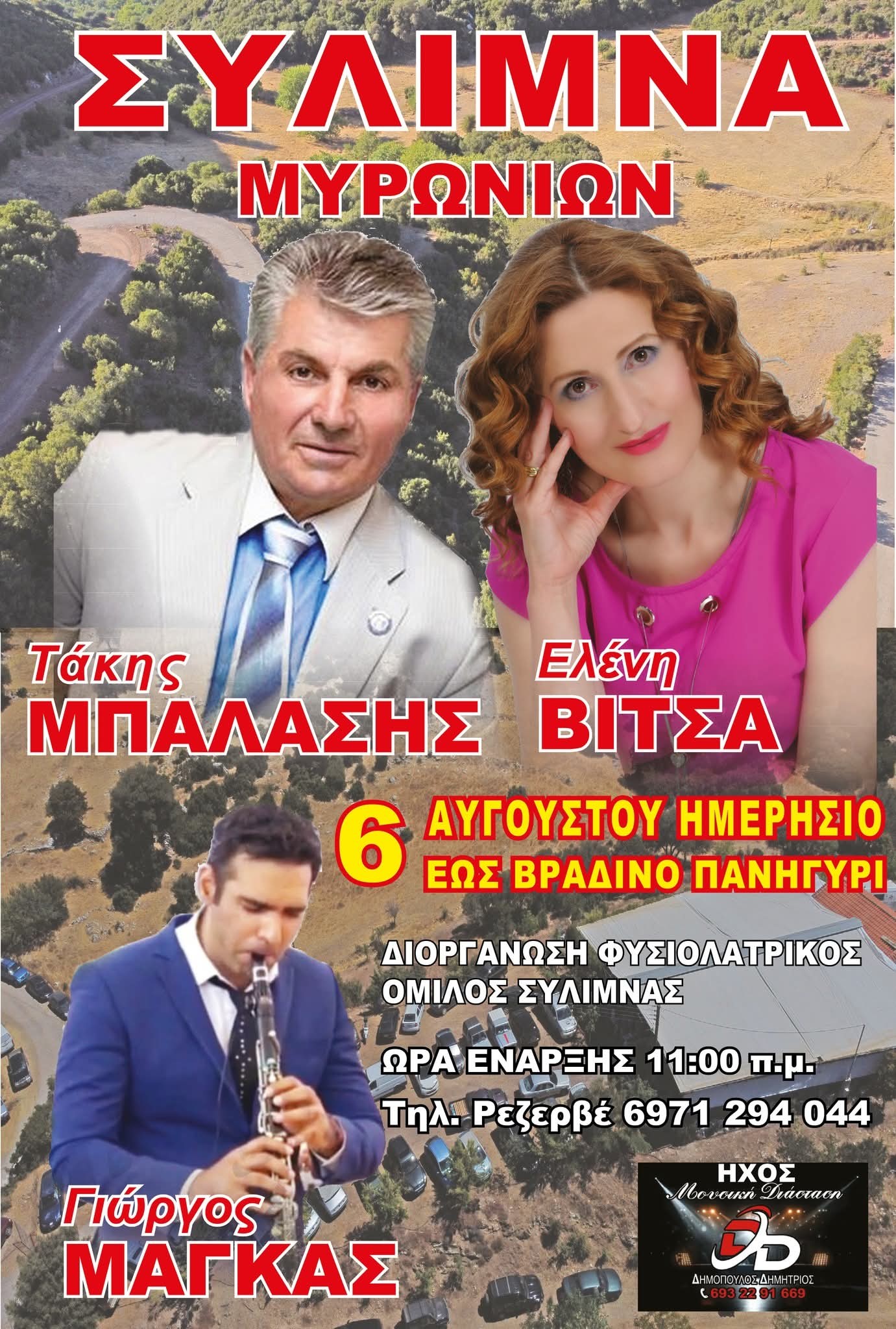 Ένα ξεχωριστό ημερήσιο γλέντι στην Συλιμνα Μυρωνιων από τον σύλλογο ‘’ Φυσιολατρικός Όμιλος Συλιμνας’’ στις 6 Αυγούστου από τις 11:00 το πρωί έως αργά το απόγευμα.