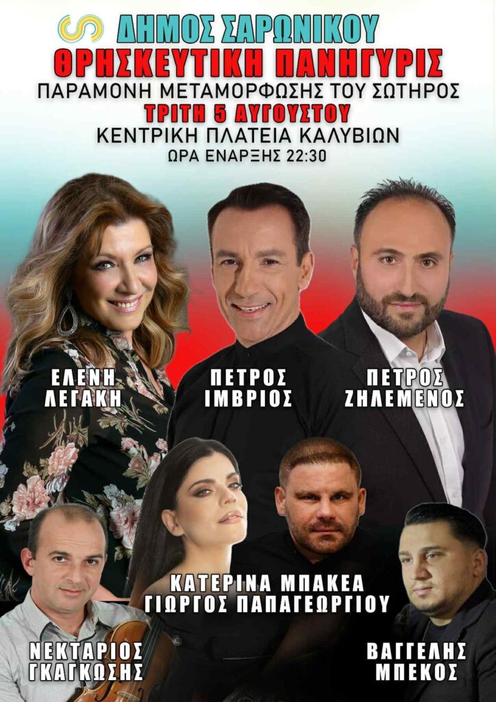 Την Τρίτη 5 Αυγούστου στην κεντρική πλατεία Καλυβιών είναι το μεγαλύτερο γλέντι στα Μεσόγεια με την σφραγίδα του Δήμου Σαρωνικού.